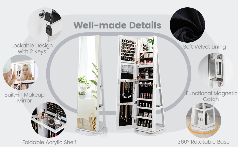 Featuring a smooth 360-degree swivel base, the mirrored jewellery organiser offers greater flexibility in positioning and use. The 3 shelves at the rear are ideal for storing handbags, books, or other items, while also enhancing the stability of the entire unit.