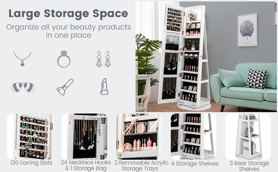 With 120 earring slots, 54 stud holes, 104 ring slots, 24 necklace hooks, 4 storage racks, 3 bracelet rods, 3 brush holders, 12 lipstick compartments and 1 dust-proof storage pocket, this jewellery cabinet offers ample storage space and keeps all your accessories neatly organised.