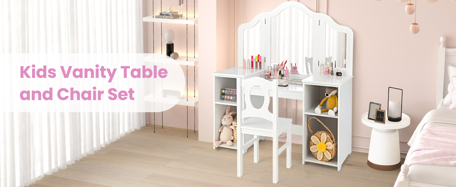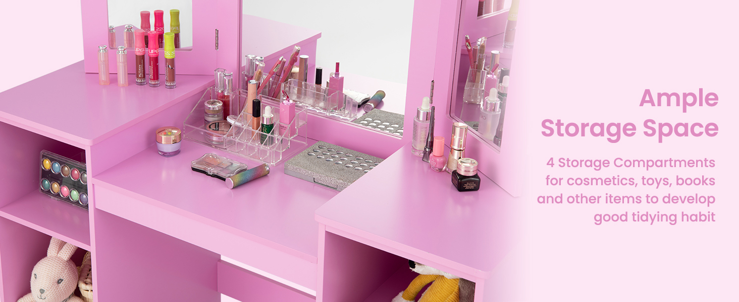 Fully Accessorised Children’s Vanity: This delightful vanity set features a high-definition tri-fold mirror that clearly reflects your child's face. The matching chair with supportive backrest ensures a comfortable seated position. Once playtime is over, little ones can tidy away their accessories into the storage shelves on either side, helping to keep their room neat and organised.