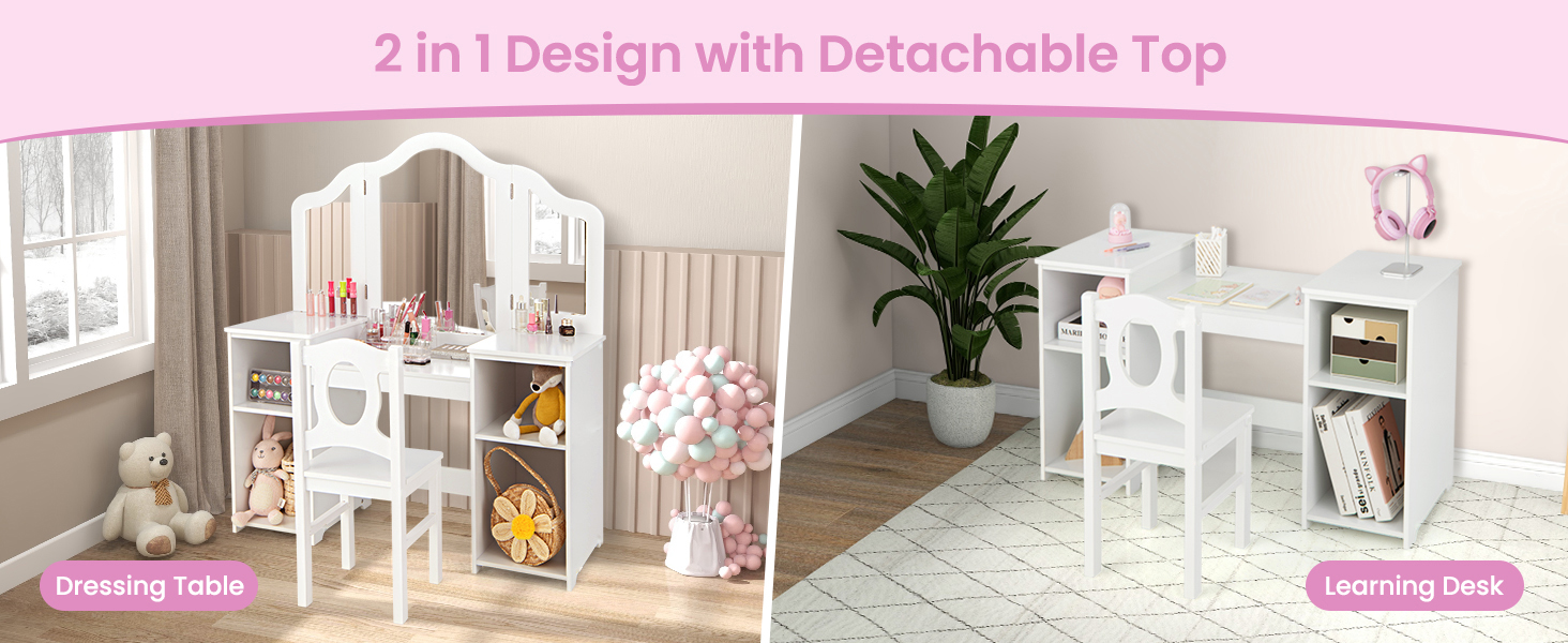 Multifunctional Table for Children: The detachable tri-fold mirror allows this vanity table to transform easily into a play table or writing desk, making it a highly versatile piece of furniture. Whether placed in the living room, bedroom, or playroom, it adapts effortlessly to your child’s needs.
