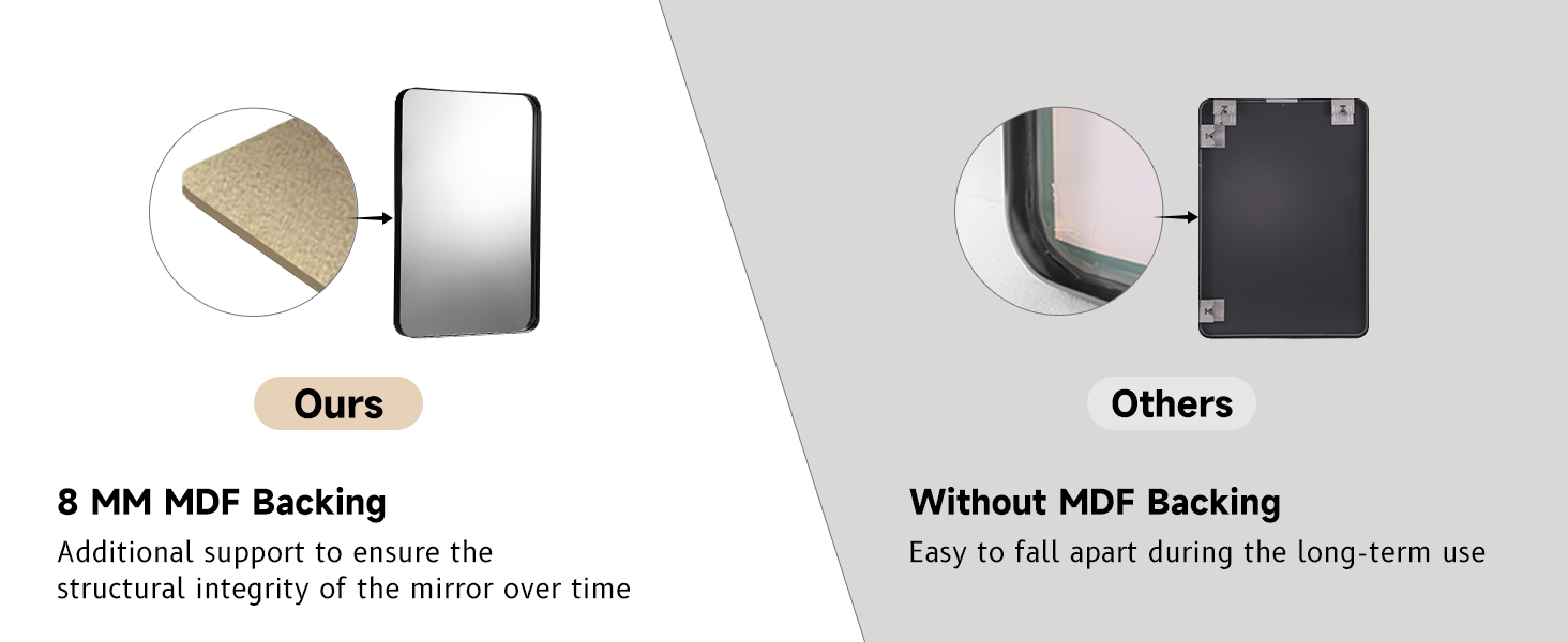 Premium & Durable Materials: This rounded rectangular wall mirror is crafted from 4 mm glass with a protective paint layer. The glass is enclosed within a rust-resistant aluminium alloy frame, and all included accessories are similarly corrosion-proof. This makes the metal-framed mirror particularly suitable for use in bathroom environments.